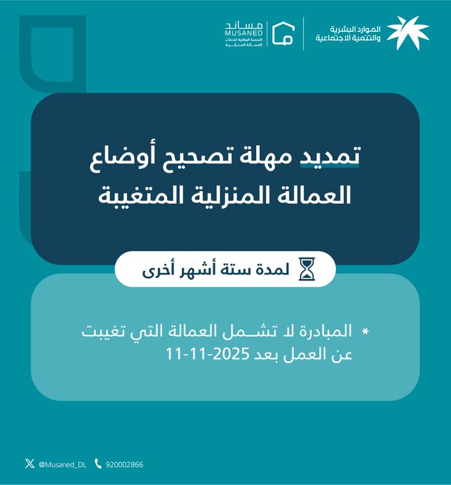 أعلنت وزارة الموارد البشرية عن تمديد مهلة تصحيح وضع العمالة المنزلية المتغيّبة حتى مايو 2026 عبر منصة #مساند بإجراءات مؤتمتة تشمل نقل الخدمات وفق المتطلبات النظامية.